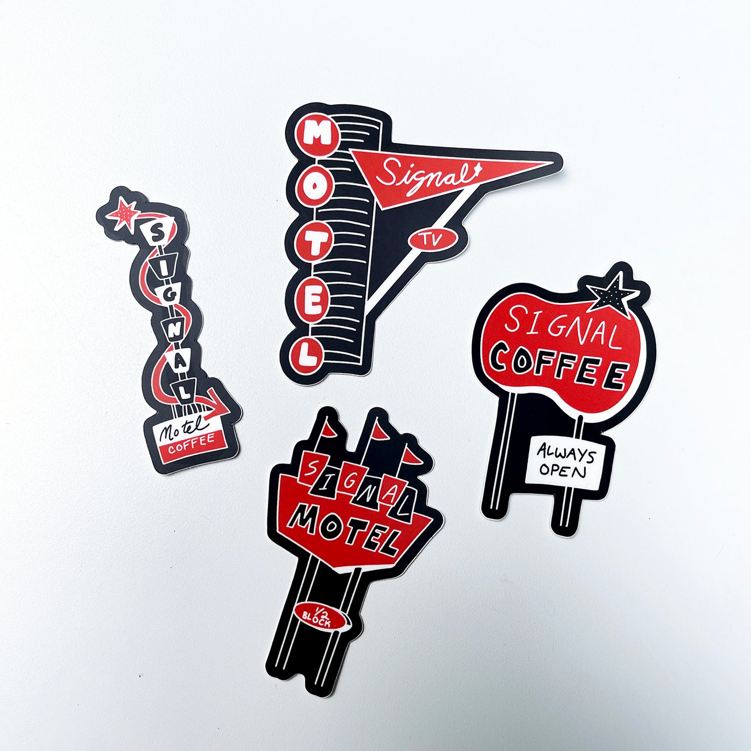 Frequent collaborator Idan Levin joined in creating these whimsical renderings of vintage motel signs featuring SIGNAL Coffee, along with Scott Levin.